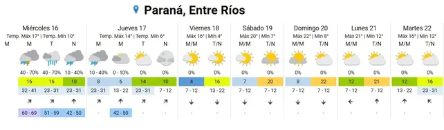 Para el martes, e tanto, se esperan temperaturas de entre 12 y 16 grados, cielo parcialmente nublado durante toda la jornada y vientos del sur rotando al sudeste.