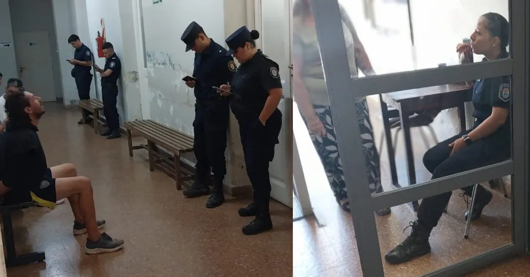 Policías en acción en los Tribunales de Concordia, son celosos custodios del orden publico y muy atentos en la prevención del delito, nada los distrae cuidando detenidos y jamas se sientan a descansar porque el delito no descansa, ellos son servidores públicos que responden como intachables profesionales al uniforme que les exige investidura. Pero a veces la realidad es otra, a veces se distraen con otros menesteres o van cansados a trabajar porque las sillas de los pasillos saben contenerlos.