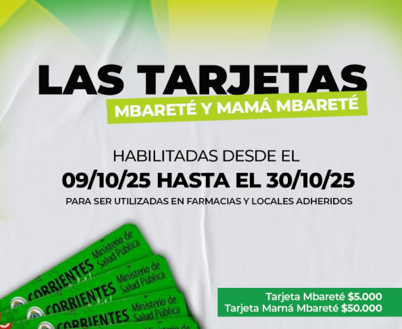 El Gobierno provincial, a través del Ministerio de Salud Pública a cargo de Ricardo Cardozo, comunica que las tarjetas Mbareté y Mamá Mbareté se encuentran habilitadas desde el 9 de octubre hasta el 30 de octubre de 2025 inclusive, para ser utilizadas por los beneficiarios de las mismas.