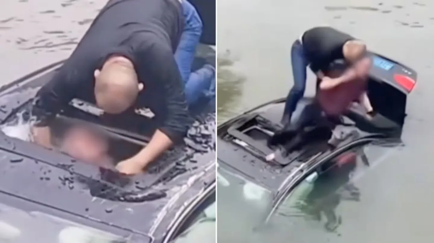 El hombre que observó la situación se tiró al agua, rompió el techo del coche y le salvó la vida a la personas que había quedado atrapada. Ocurrió en China. (Video)